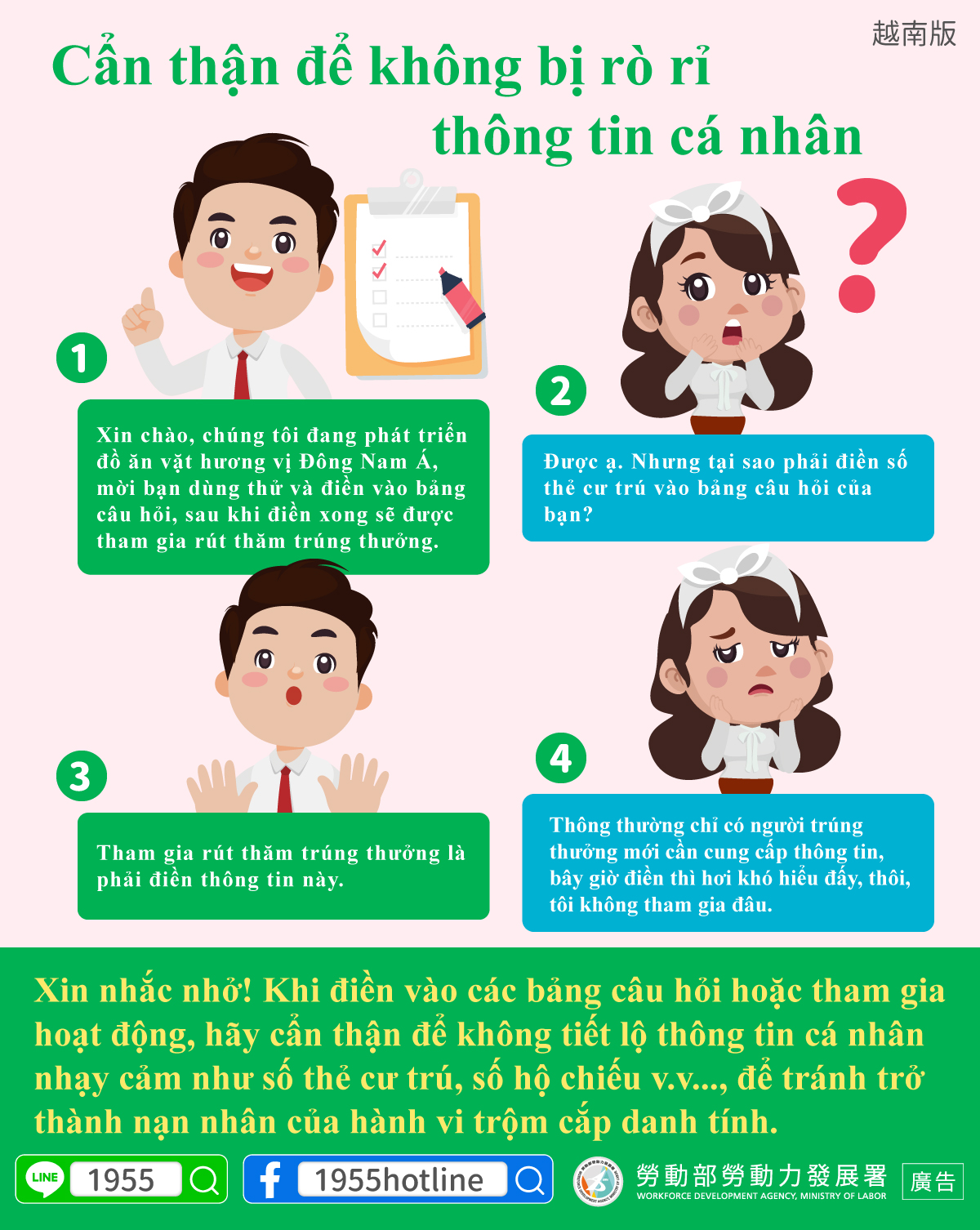 Xin nhắc nhở! Khi điền vào các bảng câu hỏi hoặc tham gia hoạt động, hãy cẩn thận để không tiết lộ thông tin cá nhân nhạy cảm như số thẻ cư trú, số hộ chiếu v.v..., để tránh trở thành nạn nhân của hành vi trộm cắp danh tính.