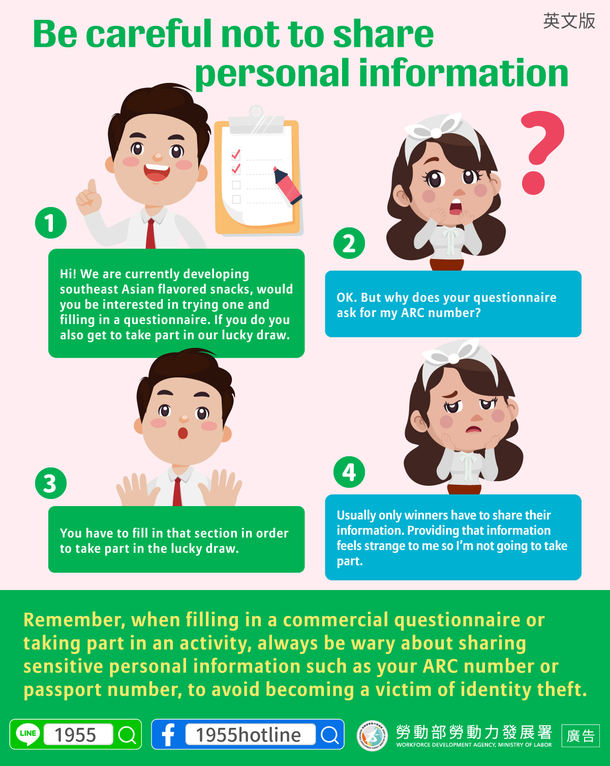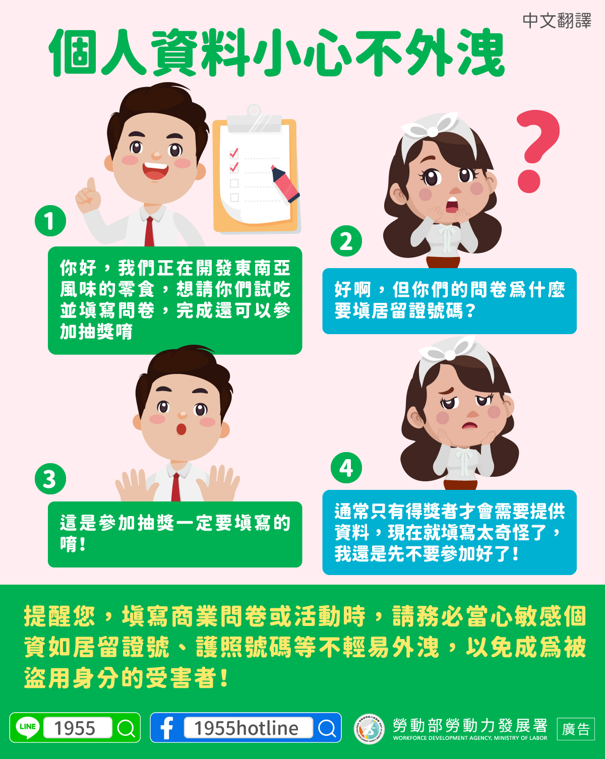 提醒您,填寫商業問卷或活動時,請務必當心敏感個資如居留證號、護照號碼等不輕易外洩,以免成為被盜用身分的受害者!