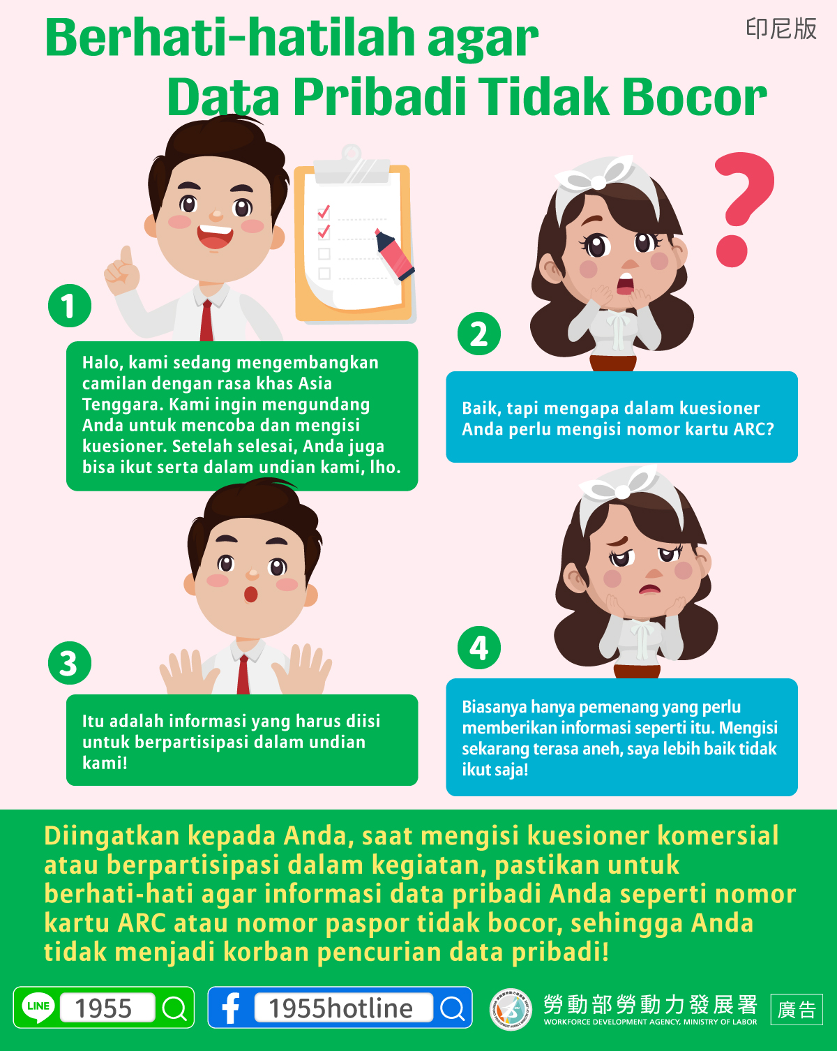 Diingatkan kepada Anda, saat mengisi kuesioner komersial atau berpartisipasi dalam kegiatan, pastikan untuk berhati-hati agar informasi data pribadi Anda seperti nomor kartu ARC atau nomor paspor tidak bocor, sehingga Anda tidak menjadi korban pencurian data pribadi!