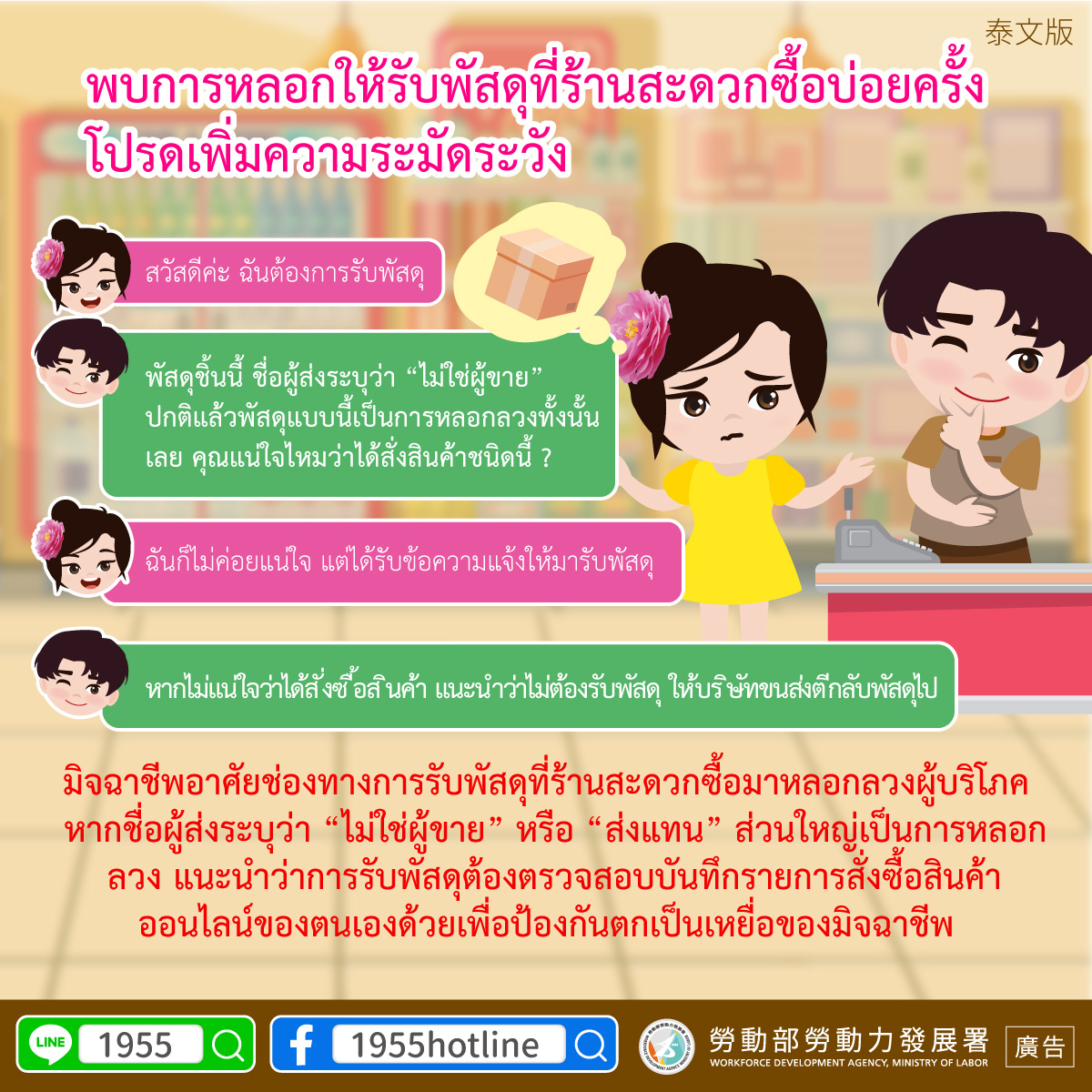 มิจฉาชีพอาศัยช่องทางการรับพัสดุที่ร้านสะดวกซื้อมาหลอกลวงผู้บริโภค หากชื่อผู้ส่งระบุว่า “ไม่ใช่ผู้ขาย” หรือ “ส่งแทน” ส่วนใหญ่เป็นการหลอกลวง แนะนำว่าการรับพัสดุต้องตรวจสอบบันทึกรายการสั่งซื้อสินค้าออนไลน์ของตนเองด้วยเพื่อป้องกันตกเป็นเหยื่อของมิจฉาชีพ