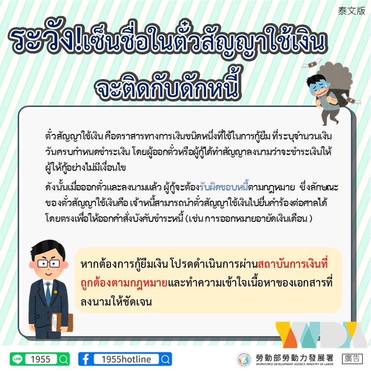หากต้องการกู้ยืมเงิน โปรดด าเนินการผ่านสถาบันการเงินที่ ถูกต้องตามกฎหมายและท าความเข้าใจเนื้อหาของเอกสารที่ ลงนามให้ชัดเจน