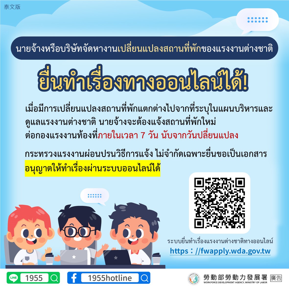 นายจ้างหรือบริษัทจัดหางานเปลี่ยนแปลงสถานที่พักของแรงงานต่างชาติ ยื่นทำเรื่องทางออนไลน์ได้!