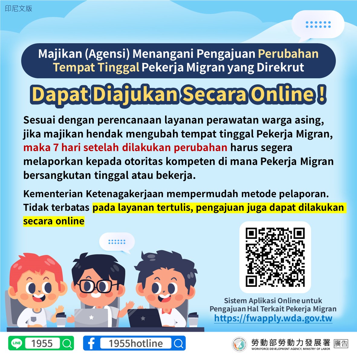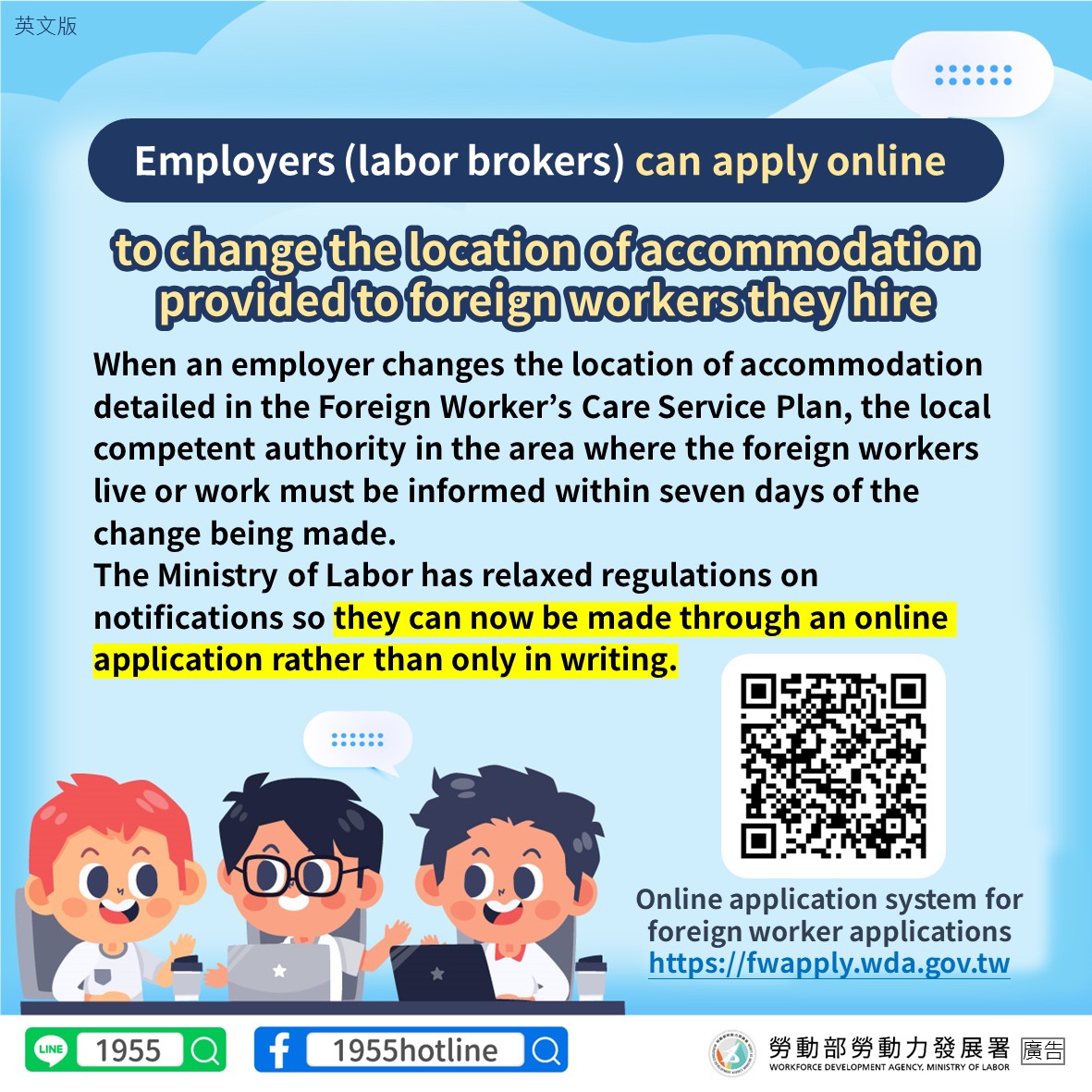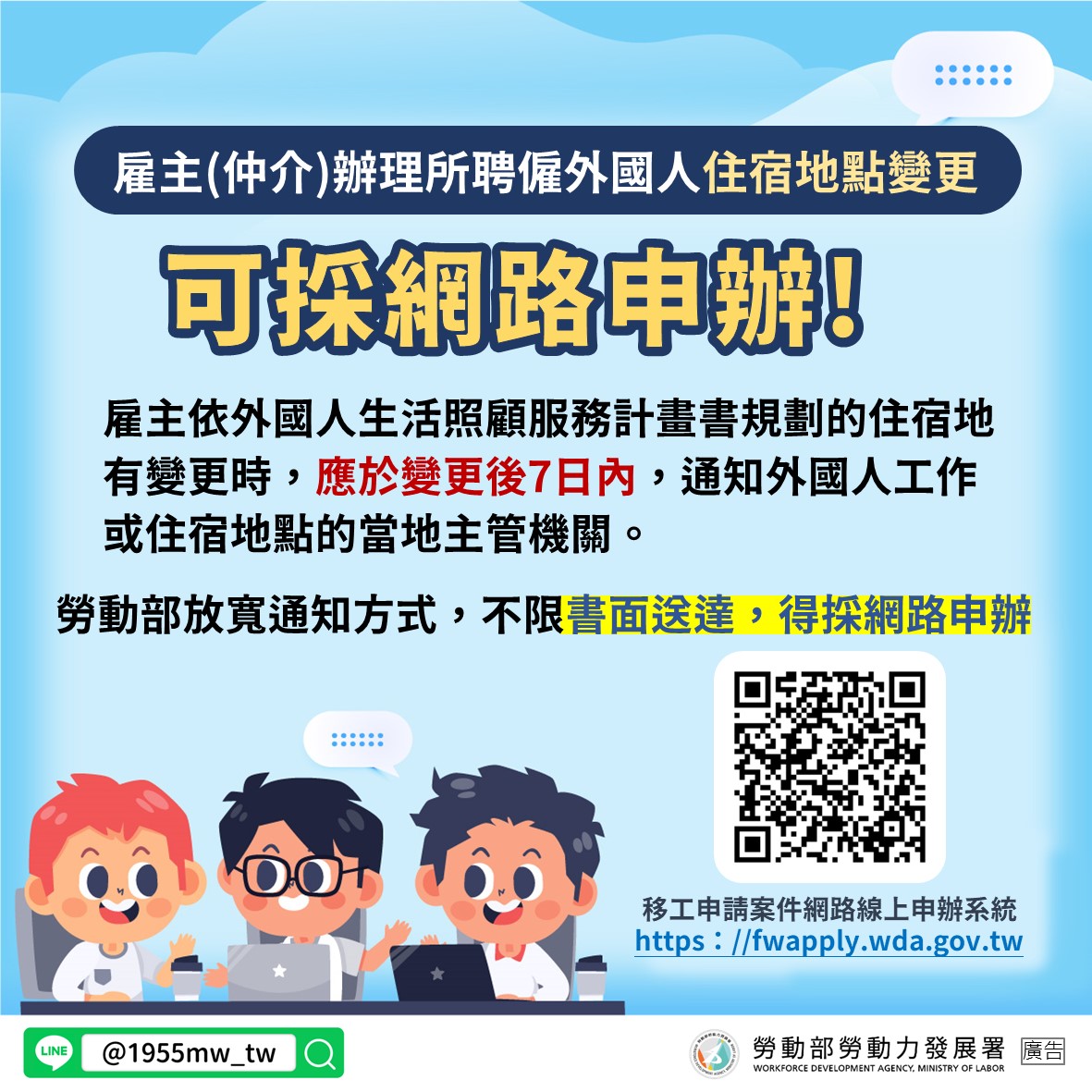 雇主(仲介)辦理所聘僱外國人住宿地點變更可採網路申辦!