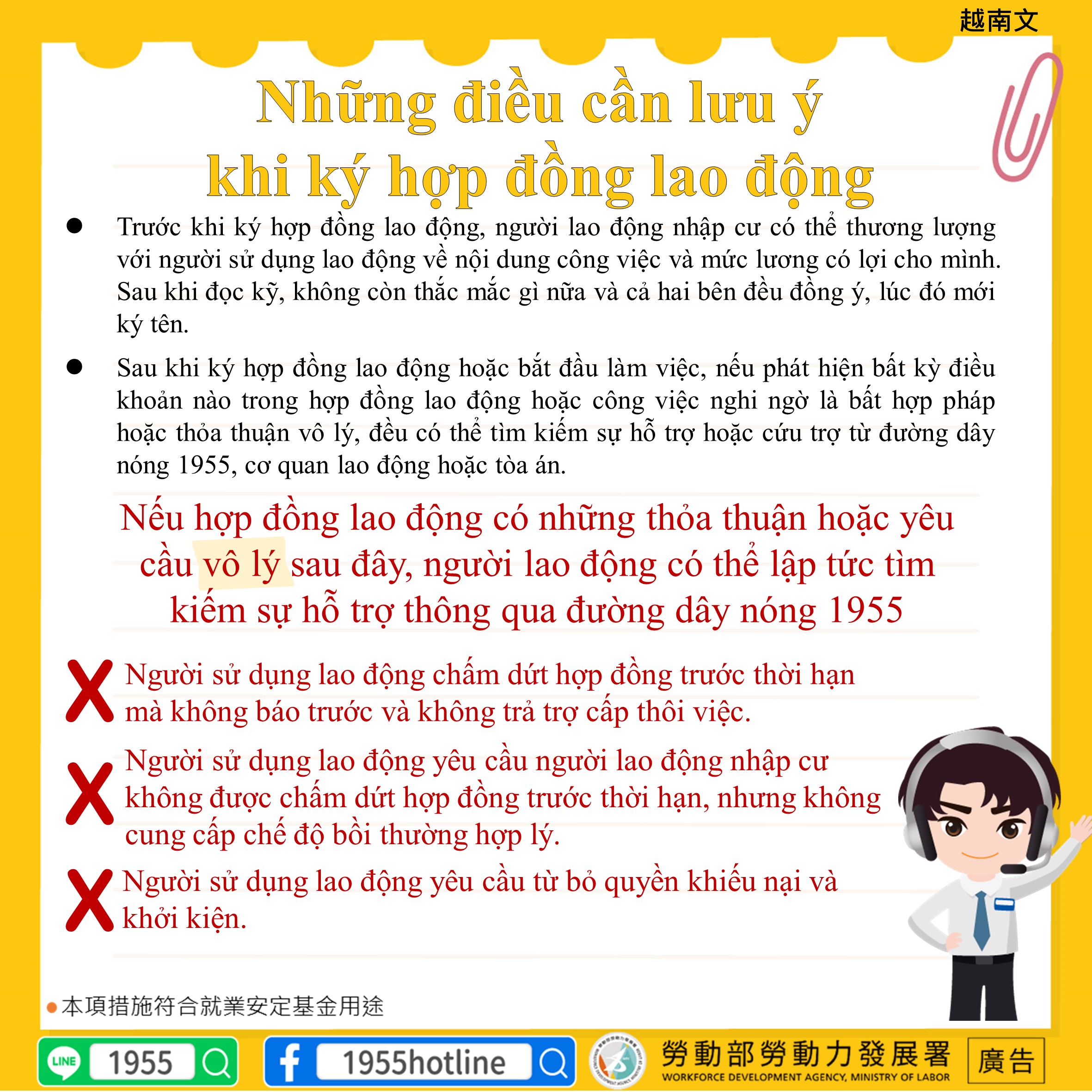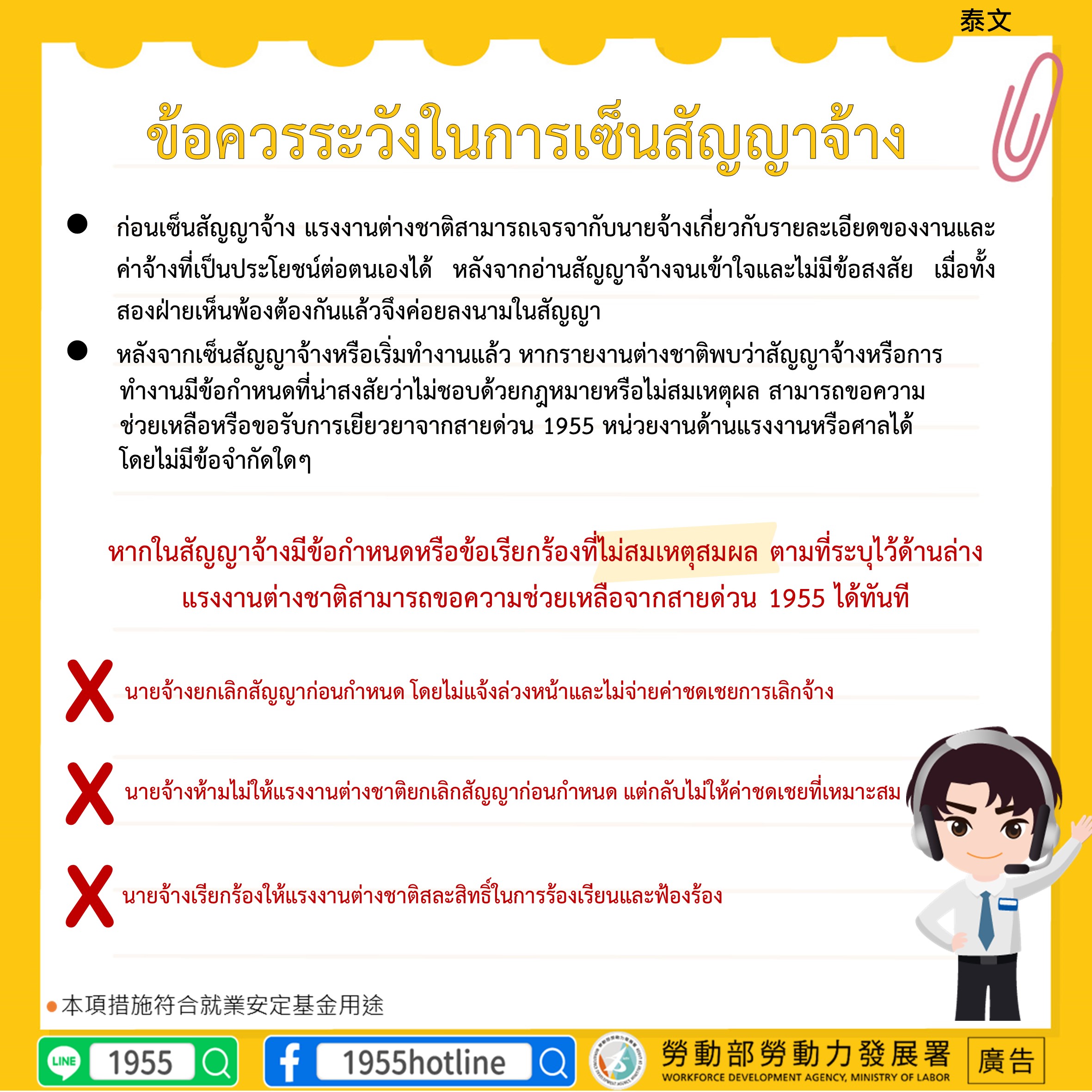 •หลังจากเซ็นสัญญาจ้างหรือเริ่มทำงานแล้ว หากรายงานต่างชาติพบว่าสัญญาจ้างหรือการทำงานมีข้อกำหนดที่น่าสงสัยว่าไม่ชอบด้วยกฎหมายหรือไม่สมเหตุผล สามารถขอความ ช่วยเหลือหรือขอรับการเยียวยาจากสายด่วน 1955 หน่วยงานด้านแรงงานหรือศาลได้โดยไม่มีข้อจำกัดใดๆ