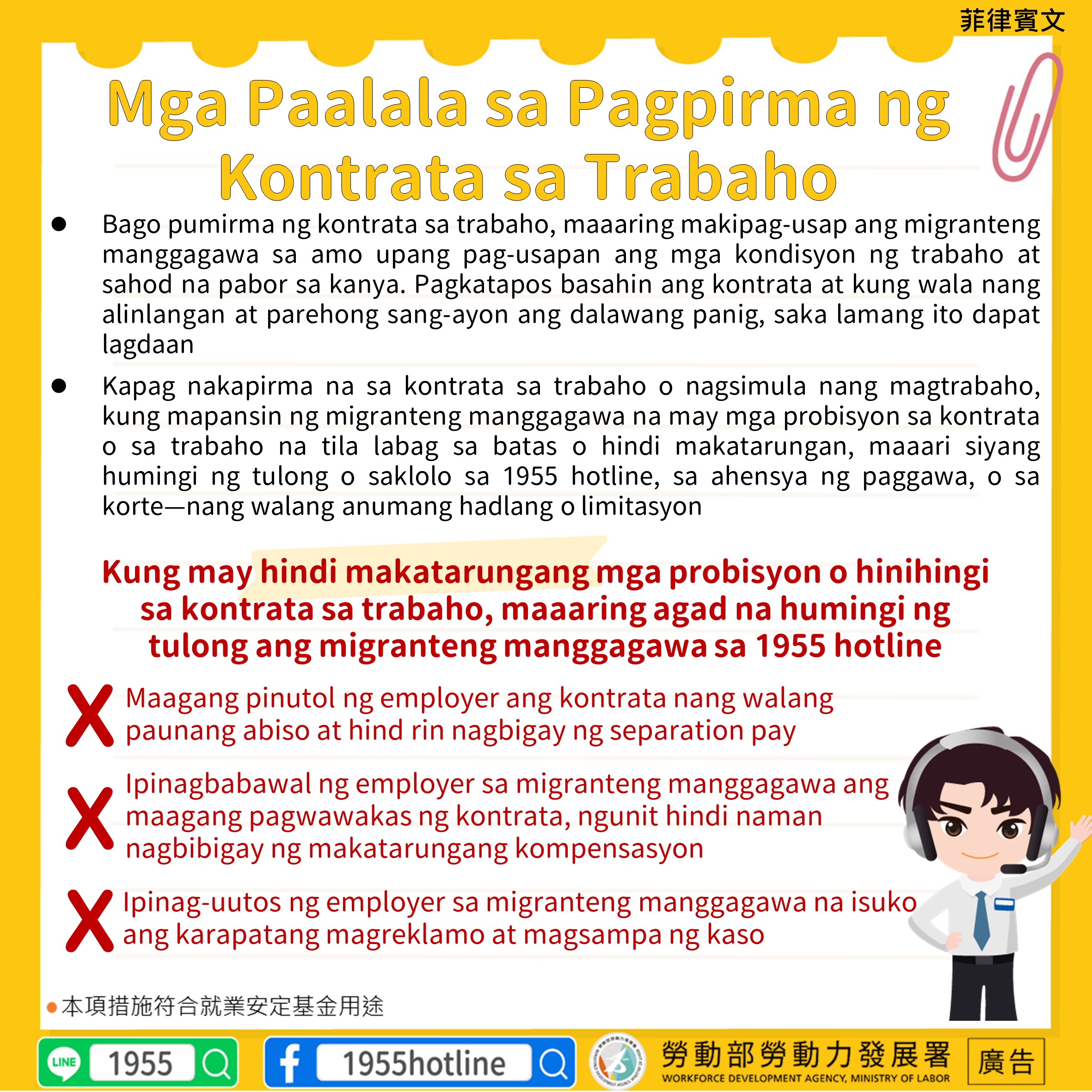 Kung may hindi makatarungang mga probisyon o hinihingi sa kontrata sa trabaho, maaaring agad na humingi ng tulong ang migranteng manggagawa sa 1955 hotline