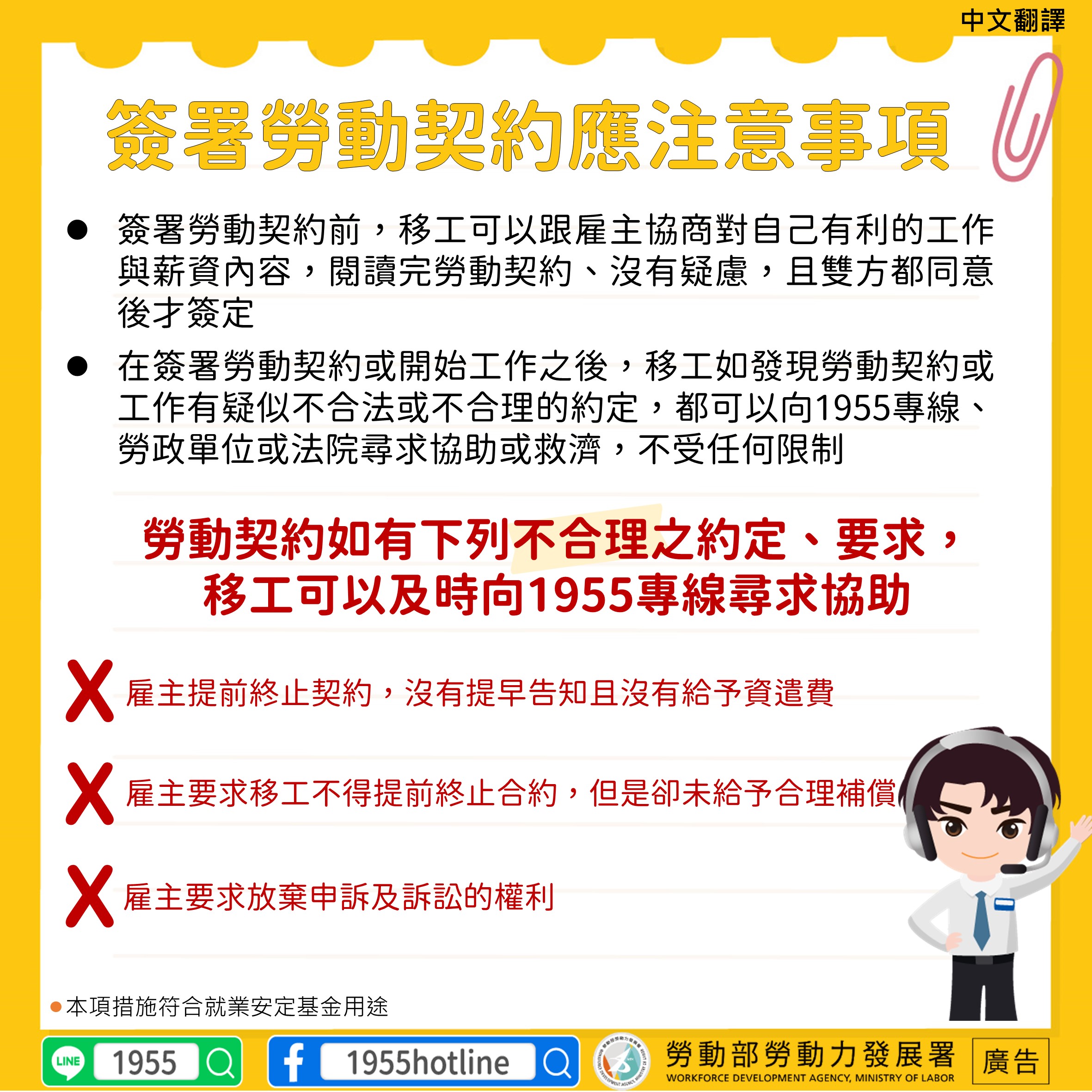 •在簽署勞動契約或開始工作之後,移工如發現勞動契約或工作有疑似不合法或不合理的約定,都可以向1955專線、勞政單位或法院尋求協助或救濟,不受任何限制