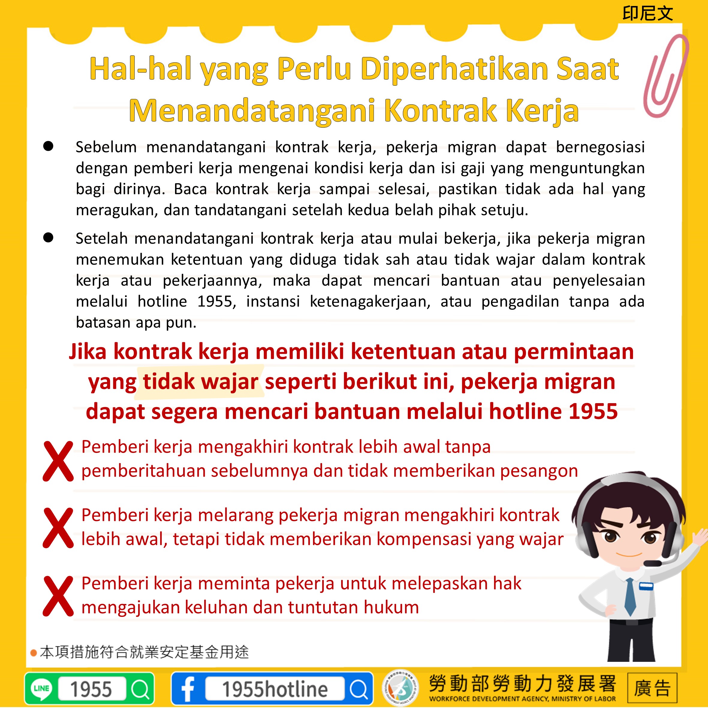 •Setelah menandatangani kontrak kerja atau mulai bekerja, jika pekerja migran menemukan ketentuan yang diduga tidak sah atau tidak wajar dalam kontrak kerja atau pekerjaannya, maka dapat mencari bantuan atau penyelesaian melalui hotline 1955, instansi ketenagakerjaan, atau pengadilan tanpa ada batasan apa pun.